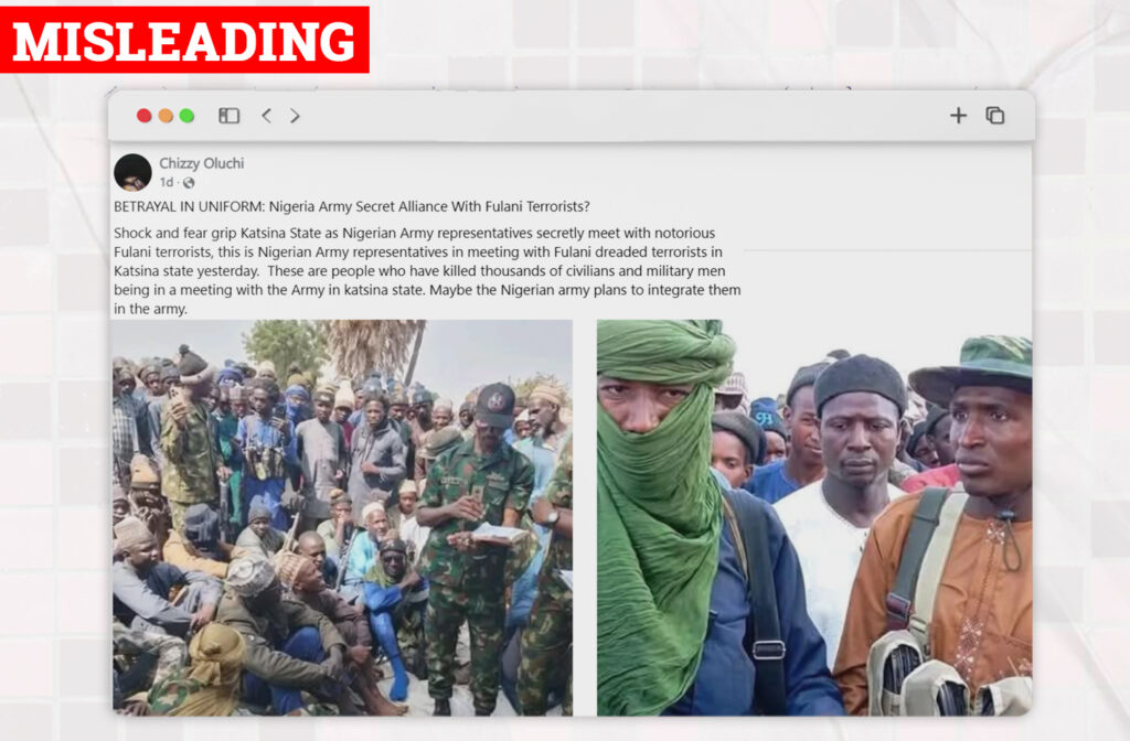 On April 24, 2025, a Facebook user, Kanu Chinenye Oluchukwu posted two photos of unidentified civilians and some men clad in military uniforms with the caption: “Shock and fear grip Katsina State as Nigerian Army representatives secretly meet with notorious Fulani terrorists, this is Nigerian Army representatives in meeting with Fulani dreaded terrorists in Katsina state yesterday. These are people who have killed thousands of civilians and military men being in a meeting with the Army in katsina state. Maybe the Nigerian army plans to integrate them in the army.”