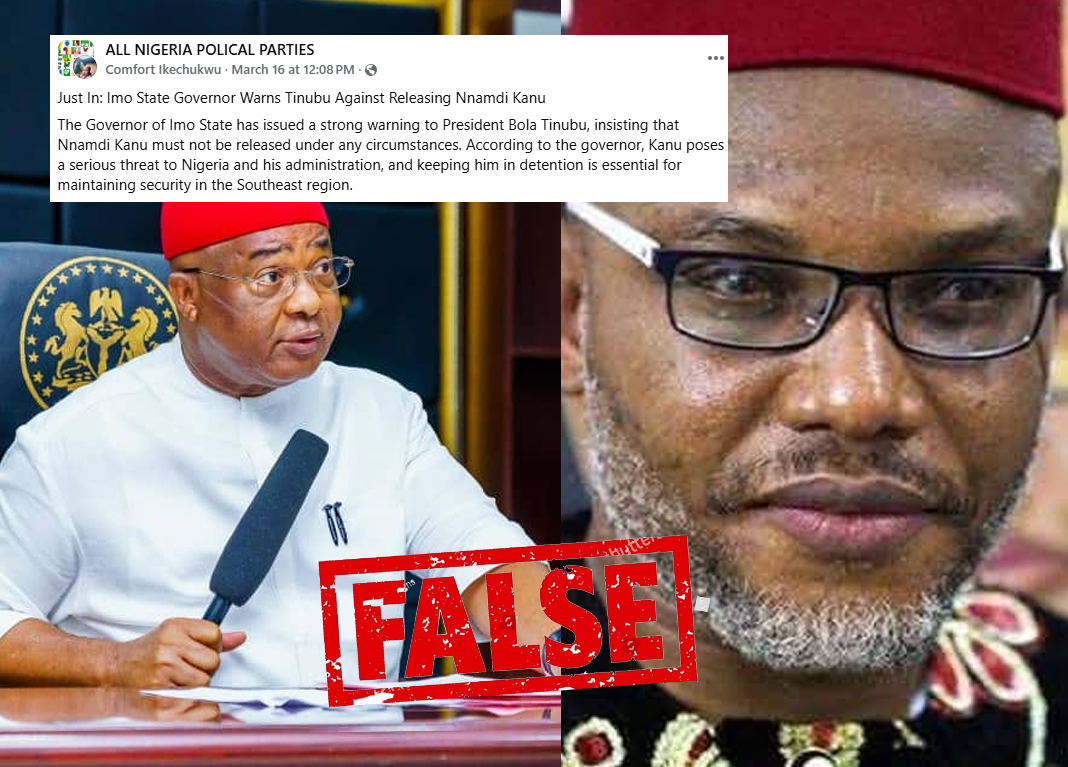 Did The Imo State Governor Warn The President Against Releasing Nnamdi Kanu? On March 16, 2025, a Facebook user @Comfortikechukwu put up a post claiming that the... Read more.