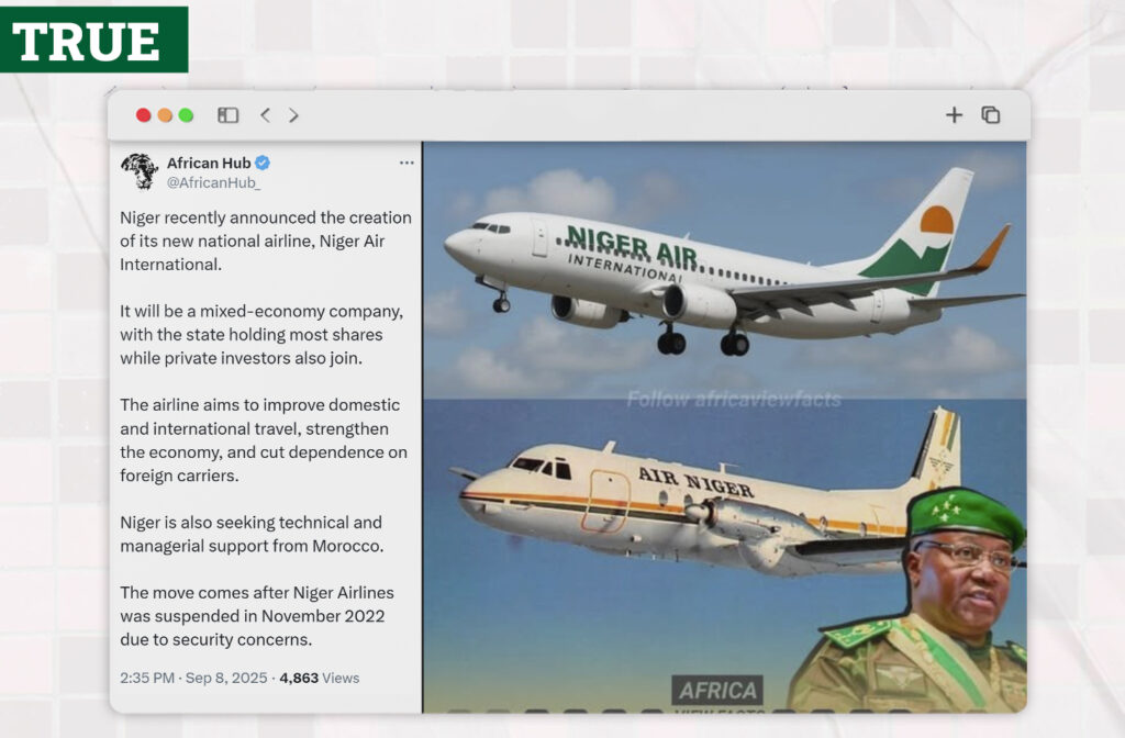 On September 8, 2025, an X (formerly Twitter) based blog claimed that the Sahel nation of Niger republic is about to establish its national carrier which will be known as ‘Niger Air International’. The claim was posted with 2 airline pictures having the inscription ‘Niger Air International’ and ‘Air Niger’, alongside the Nigerien leader, General Abdourahamane Tchiani.